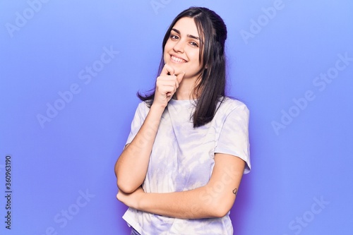 Young beautiful girl wearing casual t shirt smiling looking confident at the camera with crossed arms and hand on chin. thinking positive.