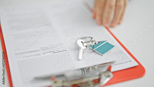 Young beautiful hispanic woman business worker sitting on table with new home contract at the office