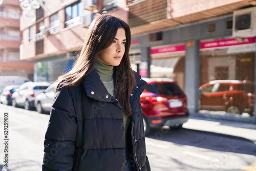 Young beautiful hispanic woman looking to the side with serious expression at street