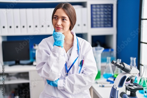 Young beautiful hispanic woman scientist smiling confident sitting on chair at laboratory