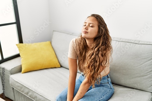 Young beautiful hispanic woman sitting on sofa breathing at home