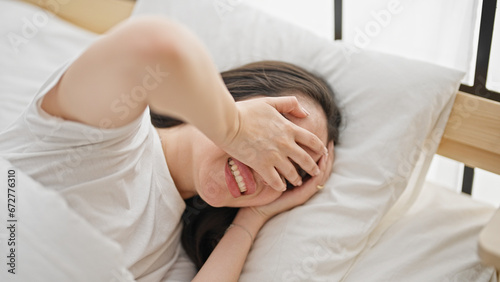 Young beautiful hispanic woman smiling confident covering eyes with hands lying on bed at bedroom