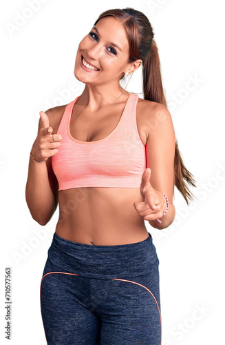 Young beautiful hispanic woman wearing sportswear pointing fingers to camera with happy and funny face. good energy and vibes.