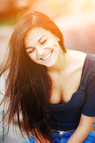 Young beautiful long-haired girl genuinely laugh, eyes closed, outdoors, close-up.