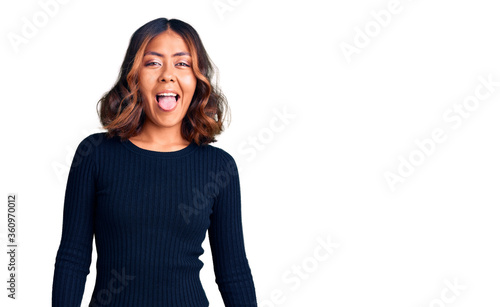 Young beautiful mixed race woman wearing casual clothes sticking tongue out happy with funny expression. emotion concept.