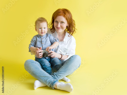 Young beautiful mother with red hair sits in a ginger little son on a yellow background in blue jeans and a white shirt