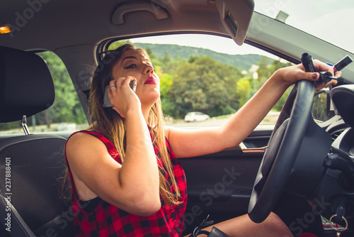 Young beautiful reckless woman using smartphone while driving car