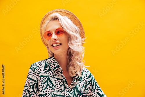 Young beautiful smiling female in trendy summer hippie costume clothes. Carefree woman posing near yellow wall in studio. Positive blond model having fun. Cheerful and happy. In hat