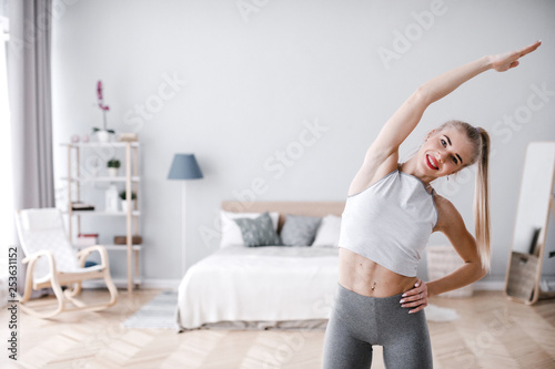 Young beautiful sporty woman at home.
