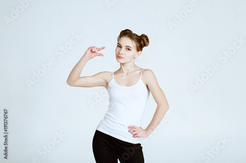 Young beautiful sporty woman in a white undershirt poses and smiles isolated on white background. Girl showing something small in size with hands
