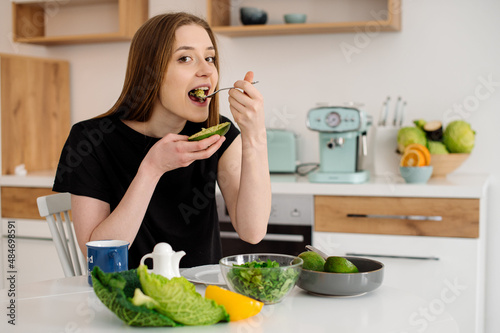 Young beautiful vegetarian girl dressed in pajamas eating fruits and vegetables for breakfast at home in the kitchen