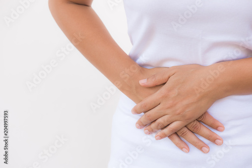Young beautiful woman having painful stomachache on white background.Chronic gastritis. Abdomen bloating concept.
