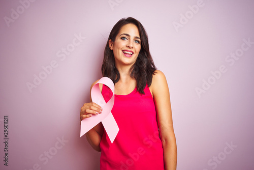 Young beautiful woman holding cancer ribbon over pink isolated background with a happy face standing and smiling with a confident smile showing teeth