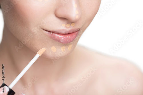 Young beautiful woman keeping makeup tassel
