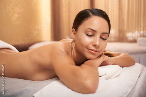 Young beautiful woman lying on massage table with eyes closed and resting after massage in beauty salon