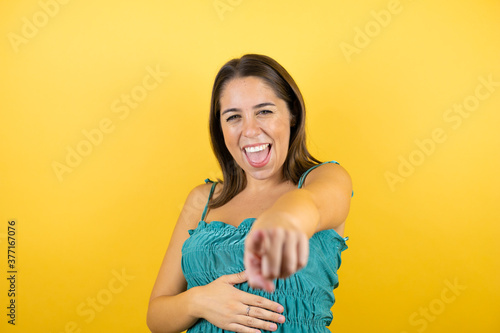 Young beautiful woman over isolated yellow background laughing at you, pointing finger to the camera with hand over body, shame expression