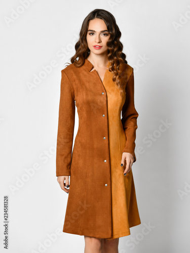 Young beautiful woman posing in new brown suede winter fashion dress