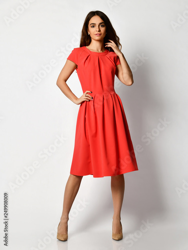 Young beautiful woman posing in new fashion casual red modern dress full body on a white
