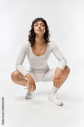 Young beautiful woman showcases stylish athletic wear in a creative studio setting