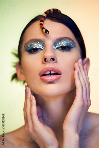 Young beautiful woman showcasing a captivating serpent in a colorful and artistic setting