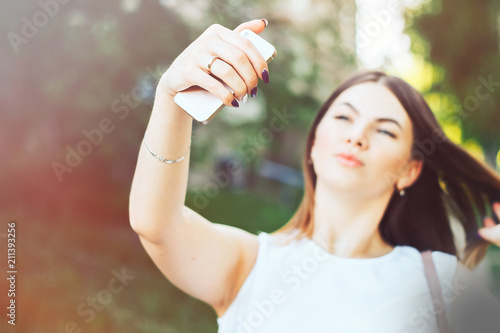 young beautiful woman, teenager, making selfie in park, girl is unfocused, focus on smartphone