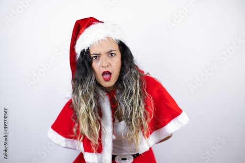 Young beautiful woman wearing a Santa Claus costume over white background afraid and shocked with surprise and amazed expression, fear and excited face.