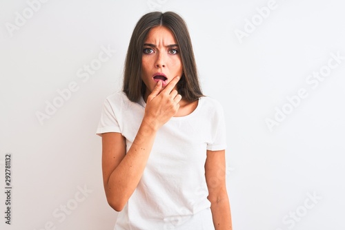 Young beautiful woman wearing casual t-shirt standing over isolated white background Looking fascinated with disbelief, surprise and amazed expression with hands on chin