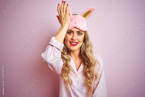 Young beautiful woman wearing pajama and sleep mask over pink isolated background surprised with hand on head for mistake, remember error. Forgot, bad memory concept.