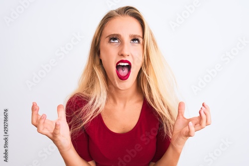 Young beautiful woman wearing red t-shirt standing over isolated white background crazy and mad shouting and yelling with aggressive expression and arms raised. Frustration concept.
