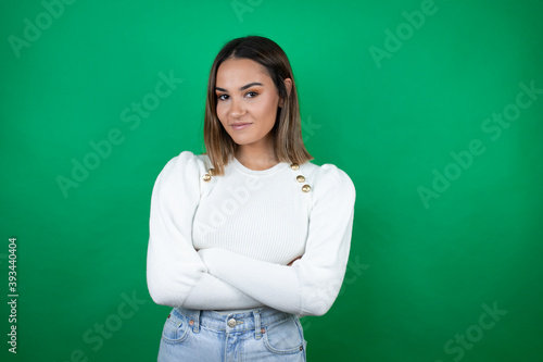 Young beautiful woman wearing white sweater over isolated green background with a happy face standing and smiling with a confident smile showing teeth with arms crossed