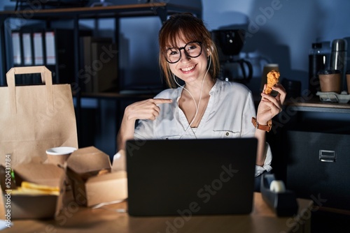 Young beautiful woman working using computer laptop and eating delivery food looking confident with smile on face, pointing oneself with fingers proud and happy.