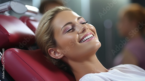 Young beutiful smiling woman sitting in dentist or cosmetologist chair.