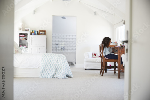Young black girl sitting at desk, doing homework in her room