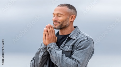 Young Black Man Clasping Hands in Prayer Pose Against a Calm Outdoor Background