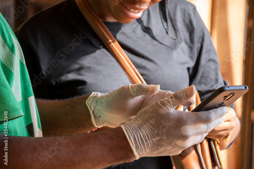 young black man wearing a surgical gloves, post covid-19 living, using a mobile phone, showing a lady content on a mobile phone