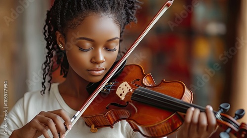 Young Black woman deeply focused while playing a violin indoors, creating a serene musical atmosphere.