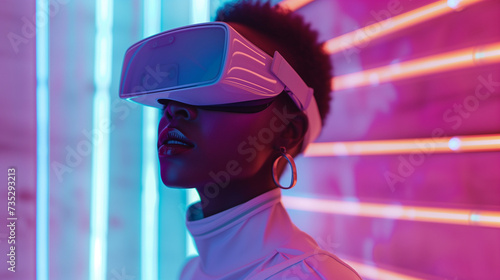 Young black woman enjoing the beauty of VR / AR worlds and fantastic landscapes