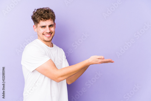 Young blond curly hair caucasian man isolated holding a copy space on a palm.