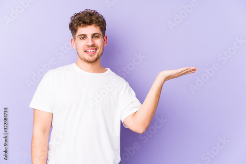 Young blond curly hair caucasian man isolated showing a copy space on a palm and holding another hand on waist.