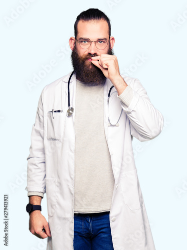 Young blond doctor man with beard wearing medical coat mouth and lips shut as zip with fingers. Secret and silent, taboo talking