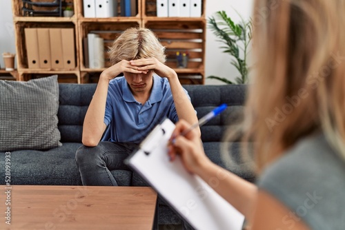 Young blond man patient stressed sitting on sofa at psychology clinic