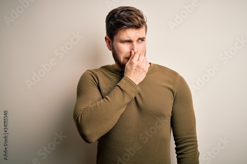 Young blond man with beard and blue eyes wearing green sweater over white background smelling something stinky and disgusting, intolerable smell, holding breath with fingers on nose. Bad smell
