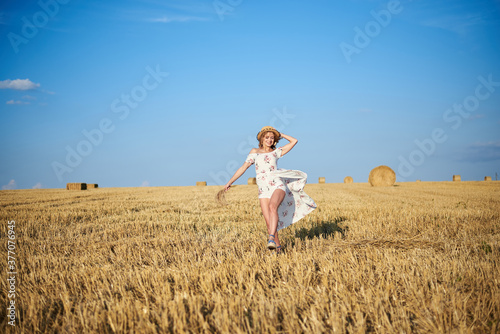 Young blond woman, wearing white romantic dress and straw hat and dried grass bouquet, jumping running on straw field in summer. Female portrait on natural background. Environmental protection.