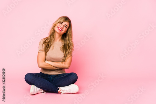 Young blonde caucasian woman sitting on a pink studio laughing and having fun.