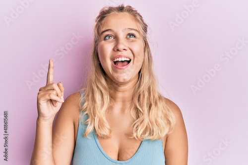 Young blonde girl wearing casual clothes pointing finger up with successful idea. exited and happy. number one.