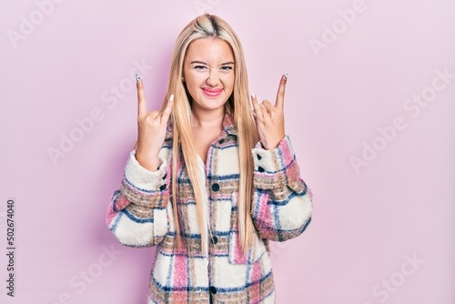 Young blonde girl wearing casual clothes shouting with crazy expression doing rock symbol with hands up. music star. heavy concept.