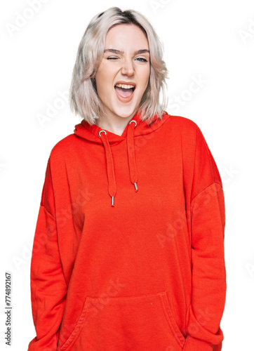 Young blonde girl wearing casual clothes winking looking at the camera with sexy expression, cheerful and happy face.