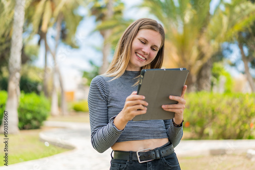 Young blonde woman at outdoors holding a tablet with happy expression