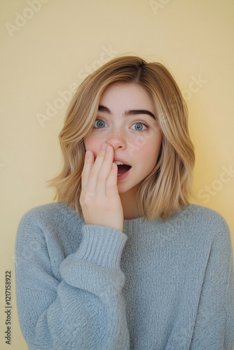 Young Blonde Woman Covering Her Mouth Playfully in a Grey Sweater
