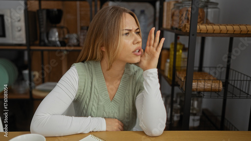 Young blonde woman cups hand over mouth calling out across wooden kitchen table next to shelving units; urgency.